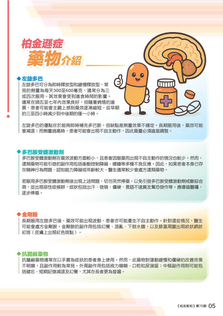 新一年又開始了,歡迎各位新加入的朋友,我們首先為大家重溫一下什麼是典型柏金遜症及柏金遜綜合徵;什麼是左旋多巴;各種藥物介紹;什麼是深腦刺激術,讓大家能對柏金遜症有更深入的了解,並以有效的方式治理,以獲得良好的生活質量。