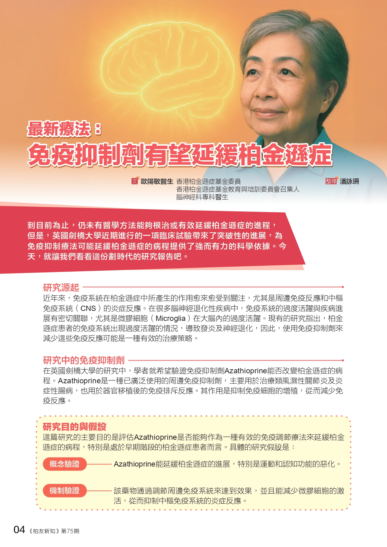 最近的研究顯示,免疫抑制劑Azathioprine可能有助於減緩柏金遜症的進展。這項臨床試驗探討了免疫系統在疾病中的作用,特別是過度活躍的微膠細胞(Microglia)與神經退化的關聯。