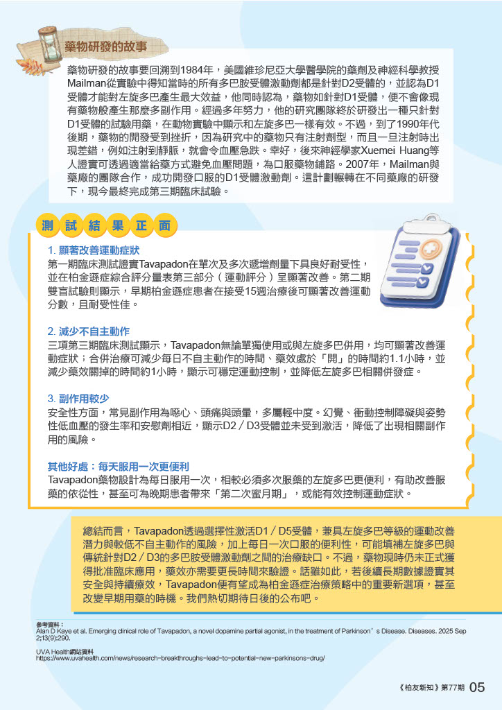 半個世紀以前,藥物左旋多巴面世,改寫了治療柏金遜症的歷史。今天,隨着藥物與診斷的研究推陳出新,一款名為Tavapadon的新藥正待審批臨床應用,它是一種能選擇性部分作用於D1/D5多巴胺受體的激動劑。該藥或能有效控制運動症狀,同時減低不自主動作的出現,為柏金遜症患者帶來新希望。