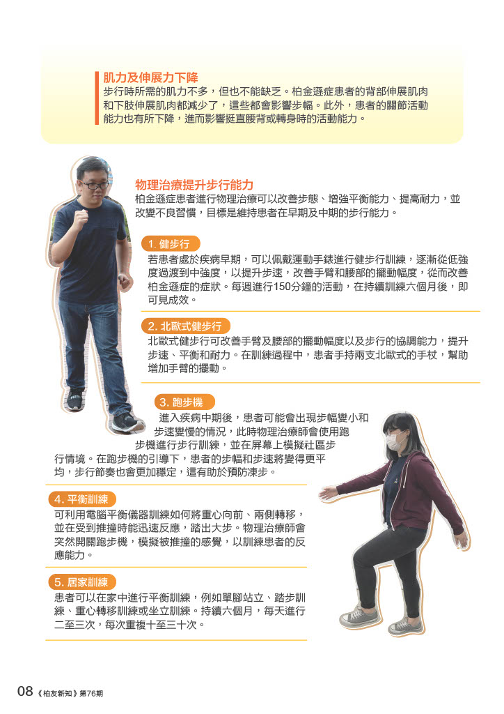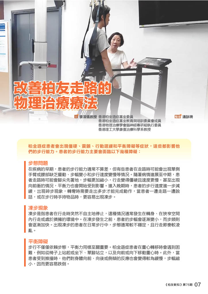 柏金遜症患者會出現僵硬、震顫、行動遲緩和平衡障礙等症狀,這些都影響他們的步行能力,有幾種障礙例如步態問題、凍步現象及平衡障礙都是患者需要面對。當然如有任何疑問,建議先諮詢物理治療師的意見。至於作為參考,如何有效地在家改善步態、增強平衡能力、提高耐力,並改變不良習慣?請詳閱《柏友新知》第76期內容:按此瀏覽