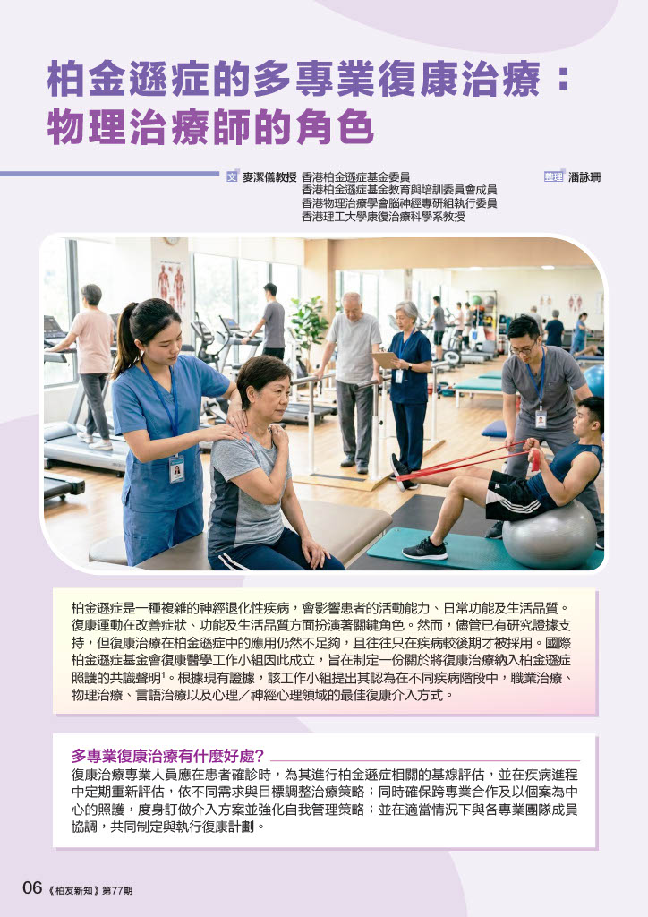 而對於柏友而言,物理治療師在身體動作、步態與平衡、運動介入、日常活動等方面皆扮演重要角色。研究顯示,物理治療可改善早期及中期柏金遜症患者的步行能力、平衡與跌倒風險。