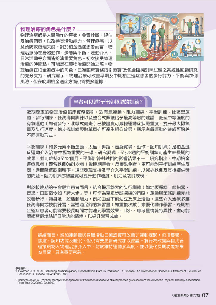 總結而言,增加運動量與身體活動已被證實可改善非運動症狀,包括憂鬱、焦慮、認知功能及睡眠,但仍需要更多研究加以佐證。將行為改變與自我管理策略納入物理治療介入中,對於維持運動參與度、並以優化長期功能結果為目標,具有重要意義。