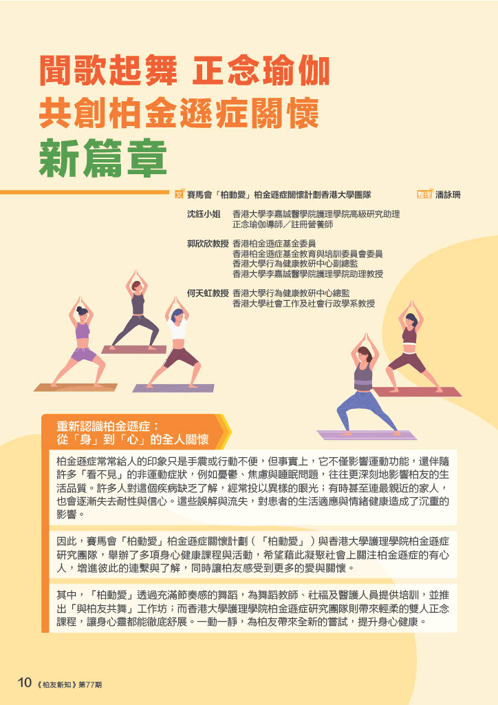 柏金遜症不僅影響運動功能,還伴隨許多「看不見」的非運動症狀,例如憂鬱、焦慮與睡眠問題,往往更深刻地影響柏友的生活品質,因此,賽馬會「柏動愛」柏金遜症關懷計劃(「柏動愛」)與香港大學護理學院柏金遜症研究團隊較早前就舉辦了多項身心健康課程與活動,當中包括「與柏友共舞」工作坊及雙人正念瑜伽課程。