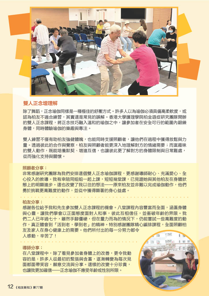 雙人正念瑜伽將正念技巧融入溫和的瑜伽之中,讓參加者在安全可行的範圍內鍛鍊身體。雙人練習透過彼此的合作與覺察,柏友與照顧者能更深入地理解對方的情緒需要;而富趣味的雙人動作,既能培養默契、增進互信,也讓彼此更了解對方的身體限制與日常難處,從而強化支持與關懷。